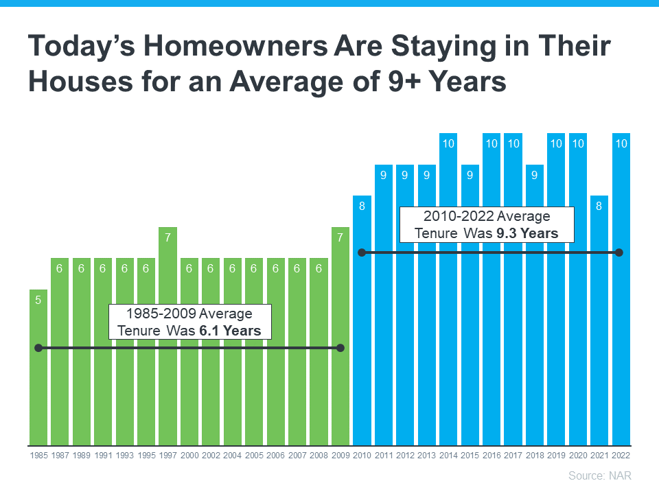 From 1985 to 2009, the average length of time homeowners stayed in their homes was roughly six years. But according to the National Association of Realtors (NAR), that number is higher today. Since 2010, the average home tenure is just over nine years (see graph below):