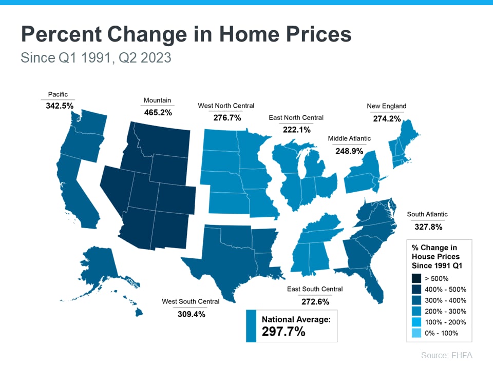 Some regions are slightly above or below that average, but overall, home prices gained solid ground in a short time. And if you expand that time frame even more, the benefit of homeownership and the drastic gains homeowners made over the years become even clearer (see map below):